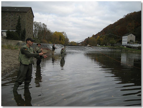 Ende um ca.19:00 Uhr Fahrt ans Gewässer, wir schulen an einem ausgesuchten Lahnabschnitt, in dem man zum Erlernen der verschiedensten Wurftechniken ideale Praxisbedingungen im Fliesswasser vorfindet. |