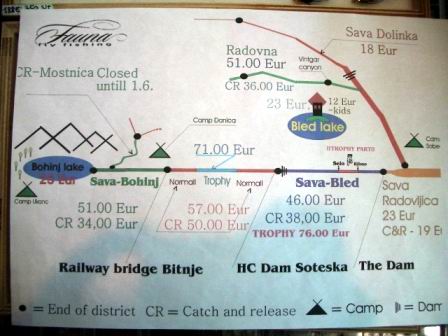 | Wir fischten in verschiedenen Sektoren von Bohinjska Bistrica bis Bled, die in der folgenden Skizze dargestellt werden und deren Preise enthalten sind. Wir hatten eine tolle Fischerei mit Trockenfliege, Nymphe und Streamer. Die Sava ist ein wunderschöner, nicht allzu schwierig zu befischender Fluß, an dem wir jeden Moment ausgekostet haben. Zur Materialwahl empfehle ich Gerät der Klasse # 3 bis max. 7. Die Schnur sollte hauptsächlich schwimmend sein und je nach Situation ist eine Sink Tip zum Einschlaufen beim Nymphen- oder Streamerfischen von Vorteil. Mein Vorfach war mindestens 3 m lang und möglichst fein gehalten, denn im superklaren Wasser macht zu kräftig gewähltes Monofil wenig Sinn. |